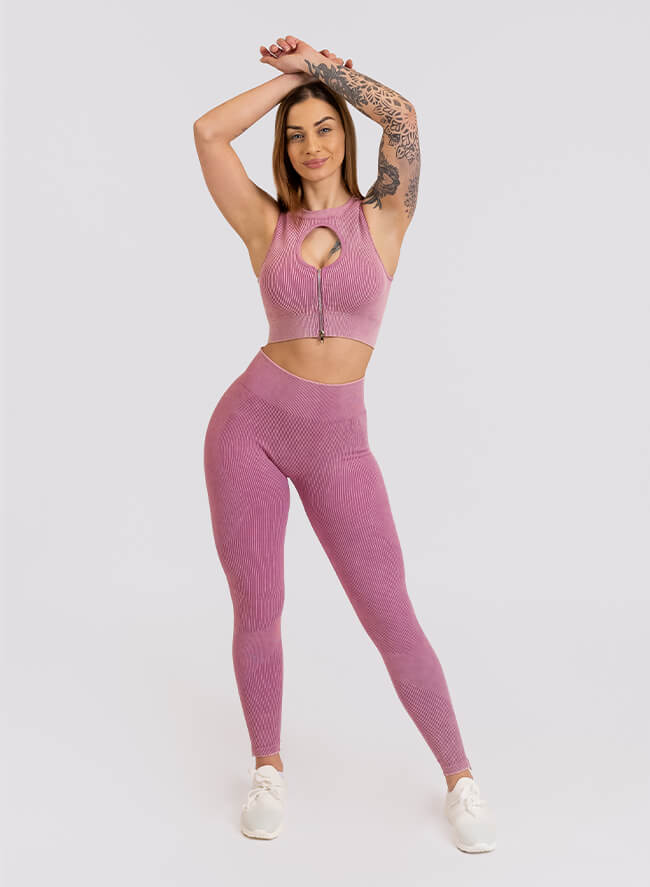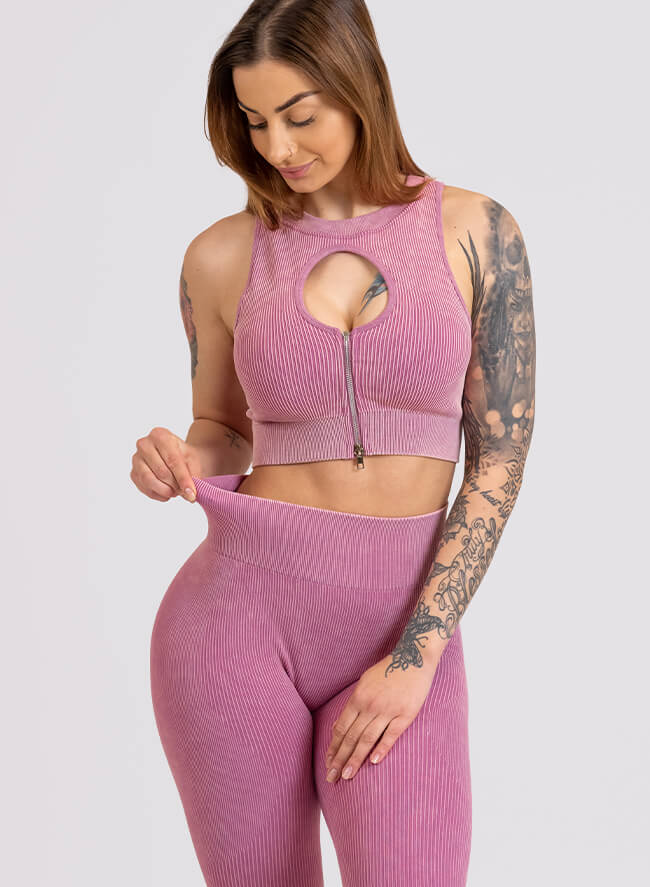 Pochlub se svými svůdnými tvary a vezmi si žebrovanou soupravu, která zdůrazní křivky a zalichotí postavě! Podprsenka s trendy výřezem se díky zipu snadno obléká i svléká. Dokonale definuje módní vkus a představuje perfektní komplet na cvičení.